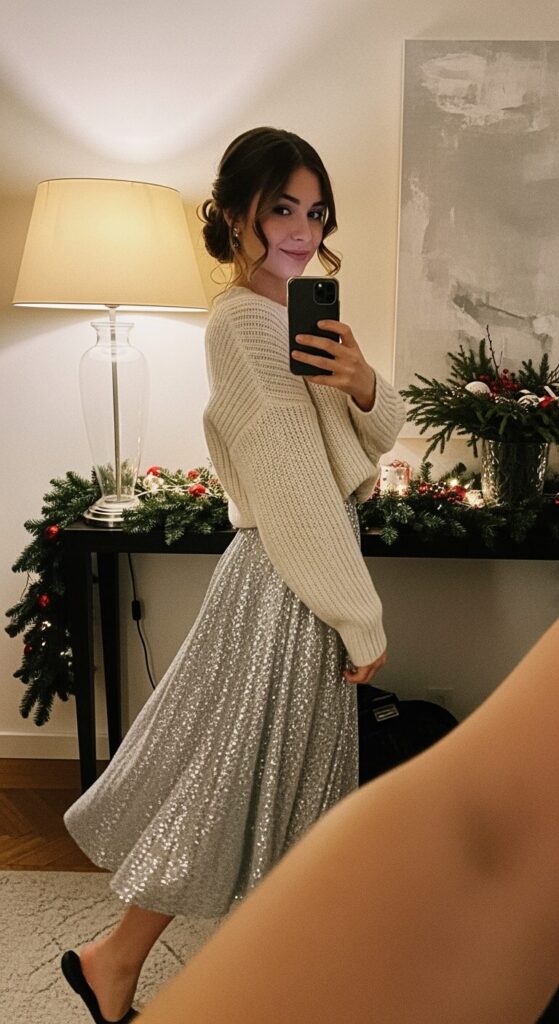 When I want comfort but also shimmer, I grab a chunky knit sweater and pair it with a silver sequin skirt.