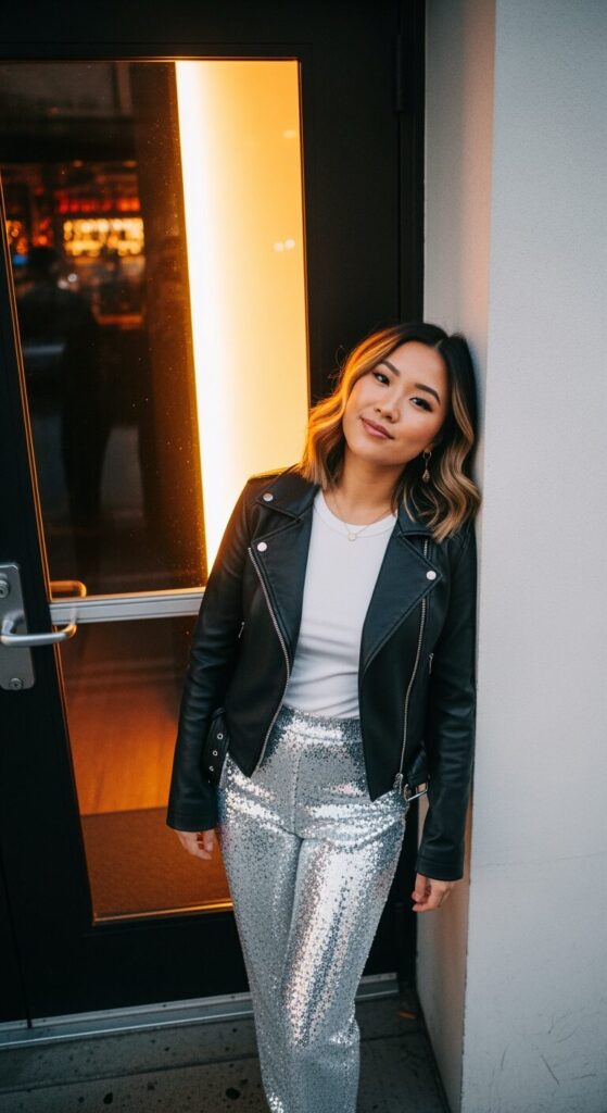 A classic leather jacket, a crisp tee, and full sequin pants that sparkle like crazy.