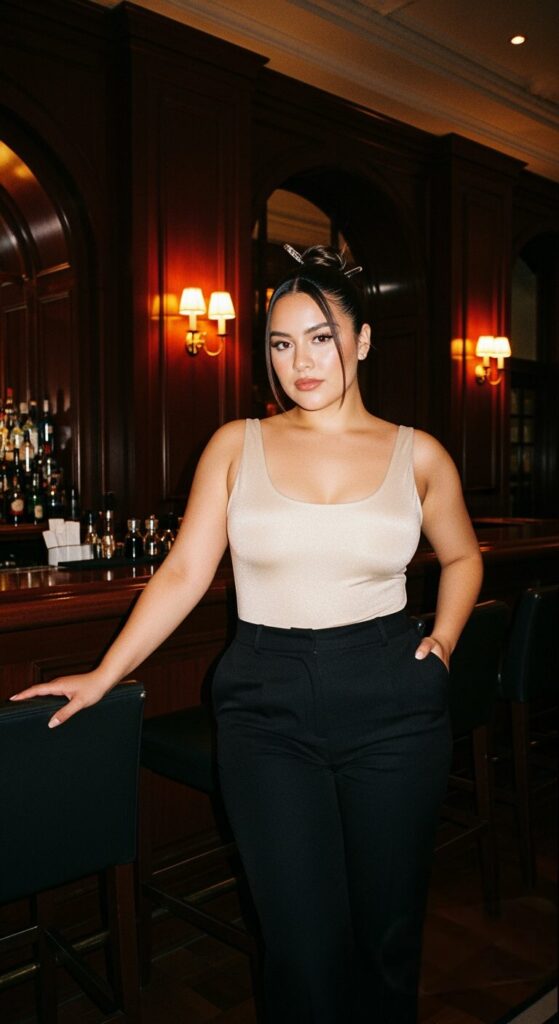 A shimmer bodysuit tucked into high-waist tailored pants makes you look polished but still party-ready.