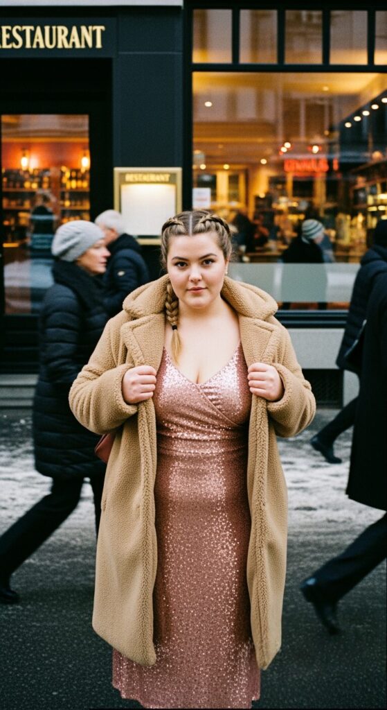 A cozy teddy coat thrown over a shimmery sequin midi dress… it just works.