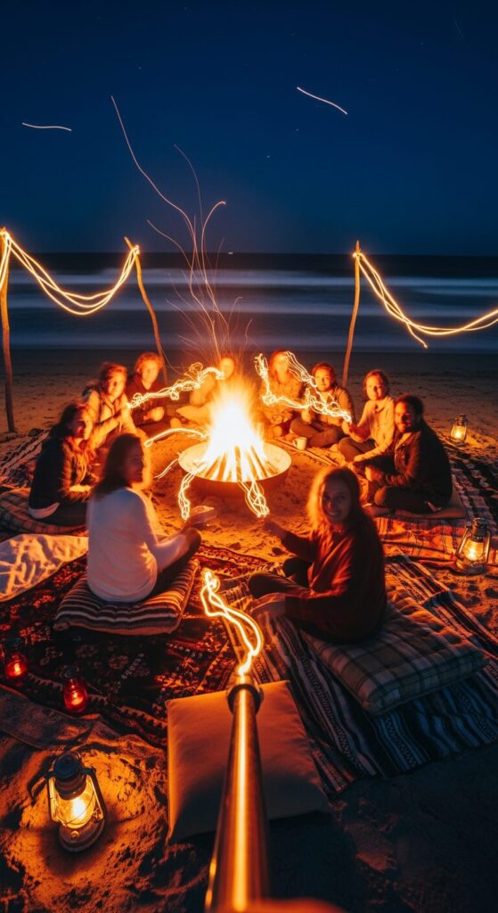 Snacks like s’mores, hot chocolate, or little finger foods keep everyone happy while the waves crash nearby. Add a few portable speakers with a playlist that’s both chill and upbeat.