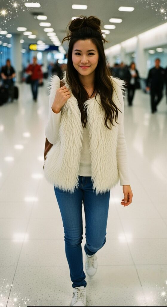 This look is a statement without sacrificing comfort. The fluffy vest adds texture and warmth (and a bit of drama), while the skinny jeans anchor the look. Best for fall travel or breezy terminals.