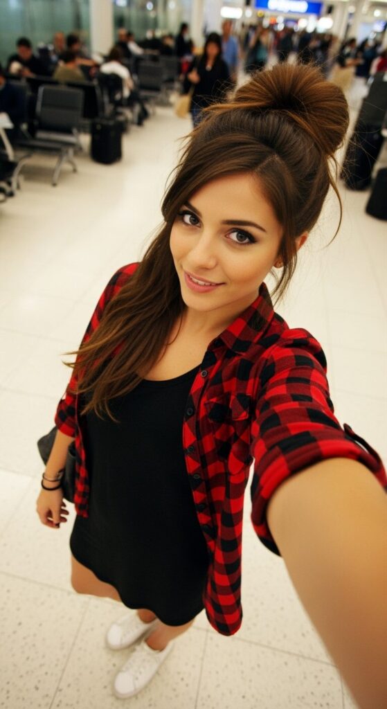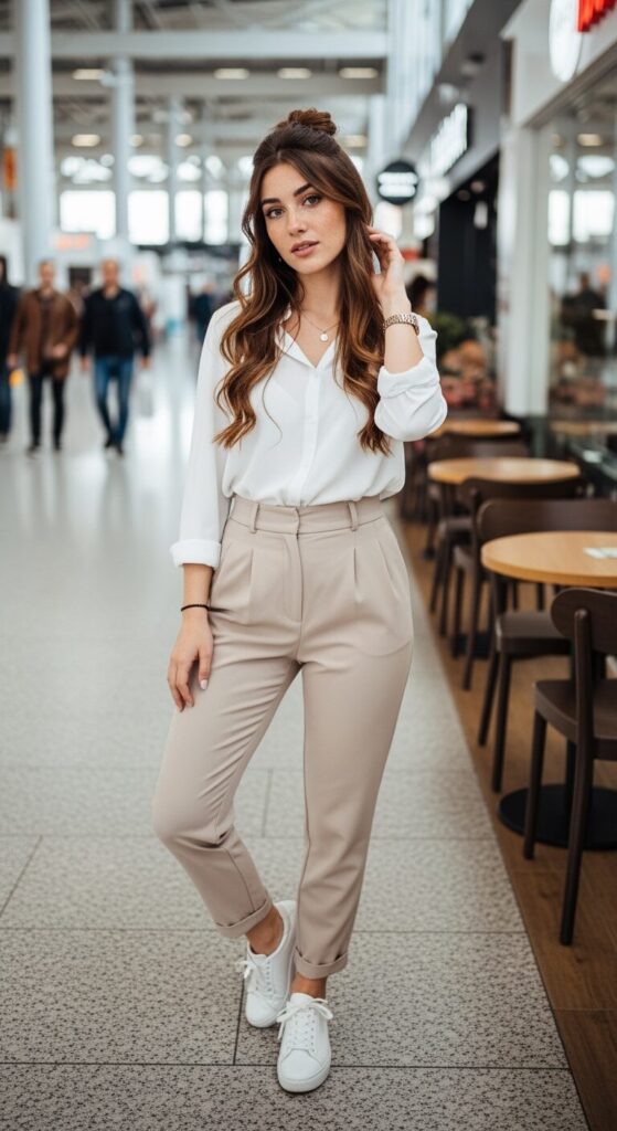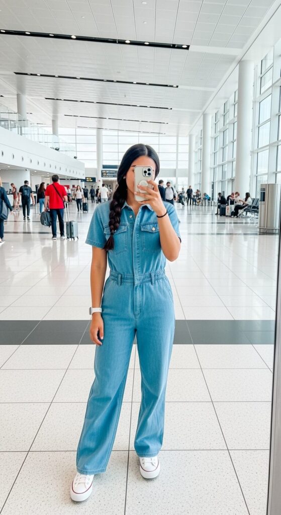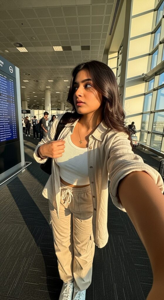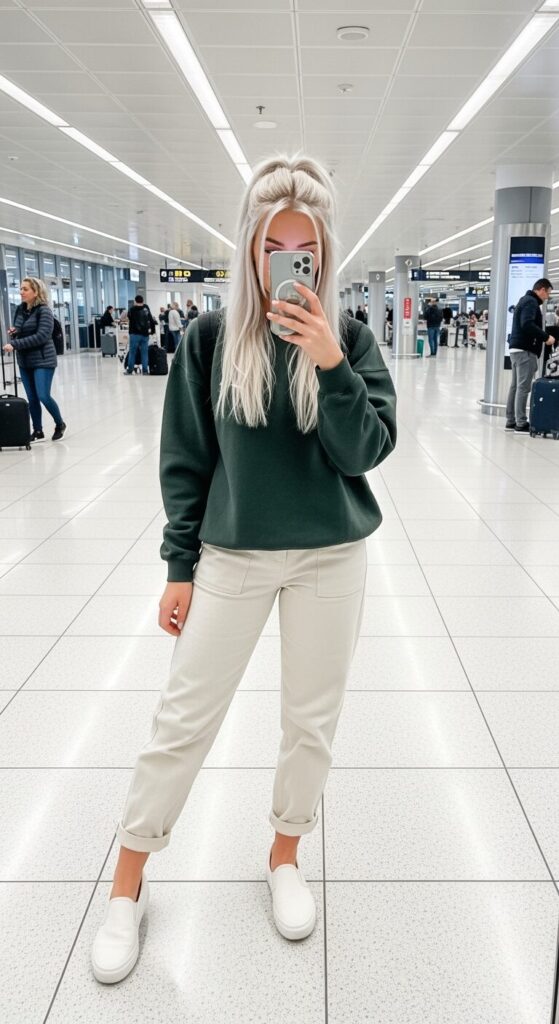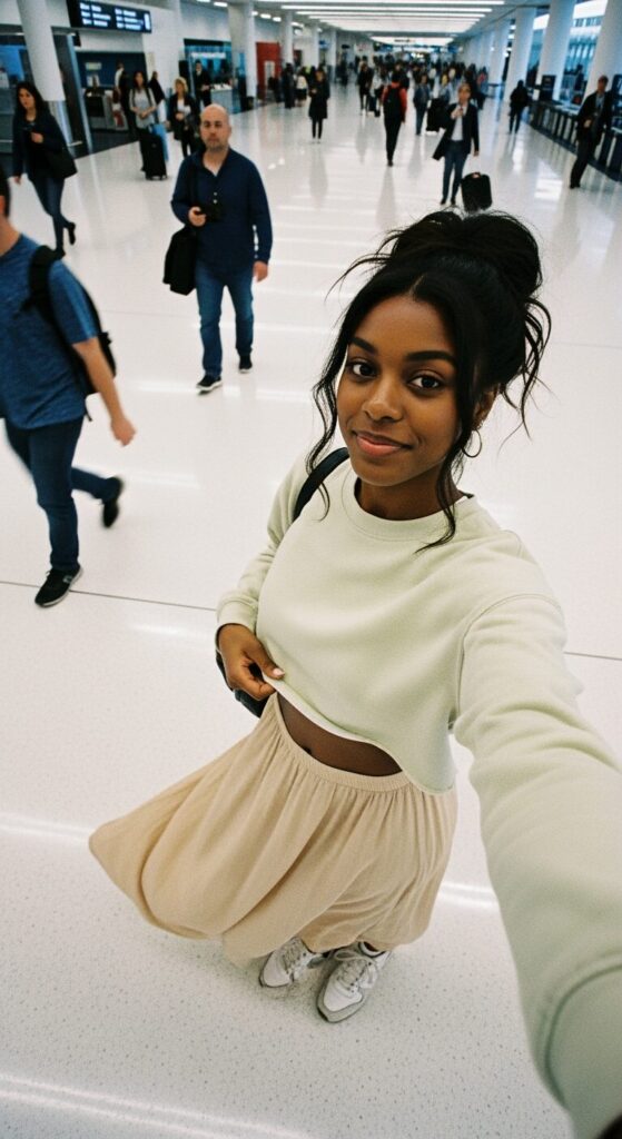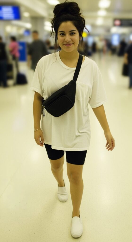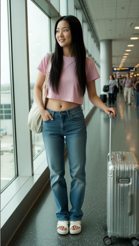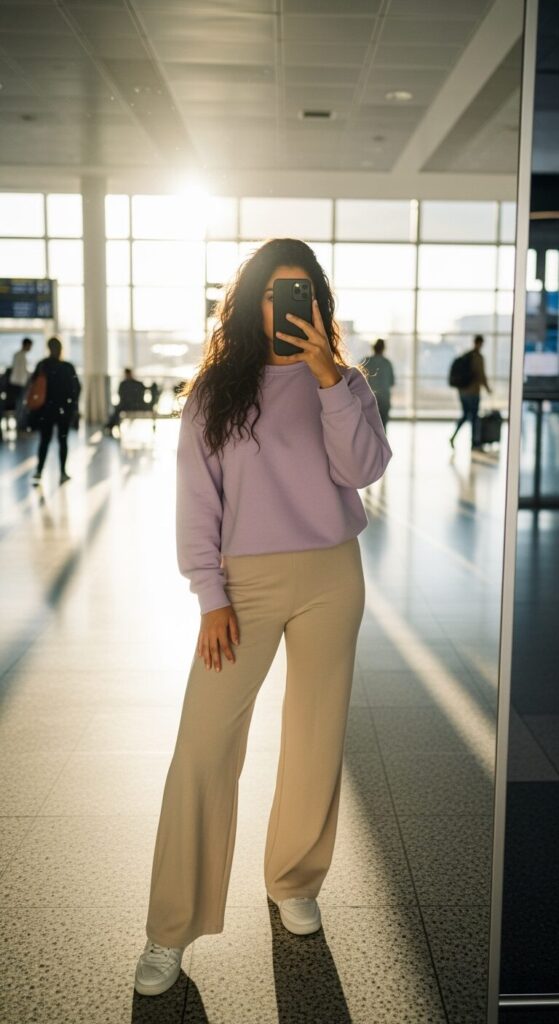 Keep your look clean and functional. Comfy pants, a cute tee, and a layer if needed—that’s all you really need. Neutral colors, soft fabrics, and easy silhouettes work best. Don’t pile on accessories or high-maintenance pieces. The simpler your outfit, the better you’ll feel moving through the airport.