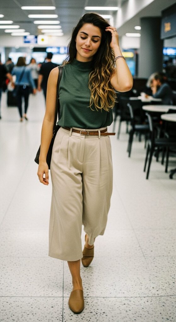 Everything about this combo is soft girl airport energy. The slouchy tank + Tencel pants keep it flowy and cool, and sporty sandals mean you’re comfy walking from gate to gate.