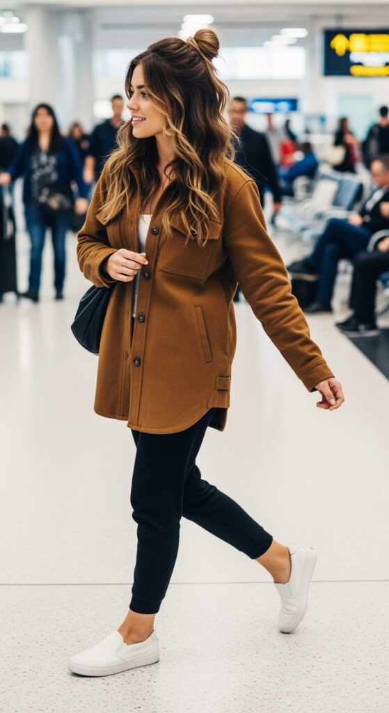 The shacket is the ultimate layering piece for airports—it’s warm enough but not bulky. Joggers underneath make the whole outfit feel cozy yet coordinated. Bonus: toss the shacket over your bag strap when you’re not wearing it.