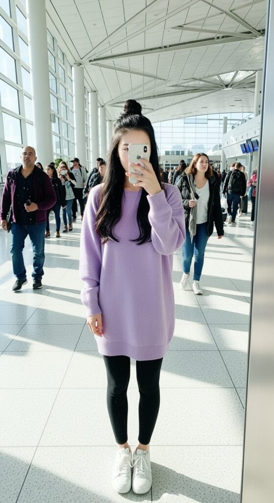 Perfect for early morning flights or chilly terminals, this look keeps you warm without overheating. The ribbed flare leggings are flattering and stretchy, while sock sneakers are stylish and airport-security-friendly.