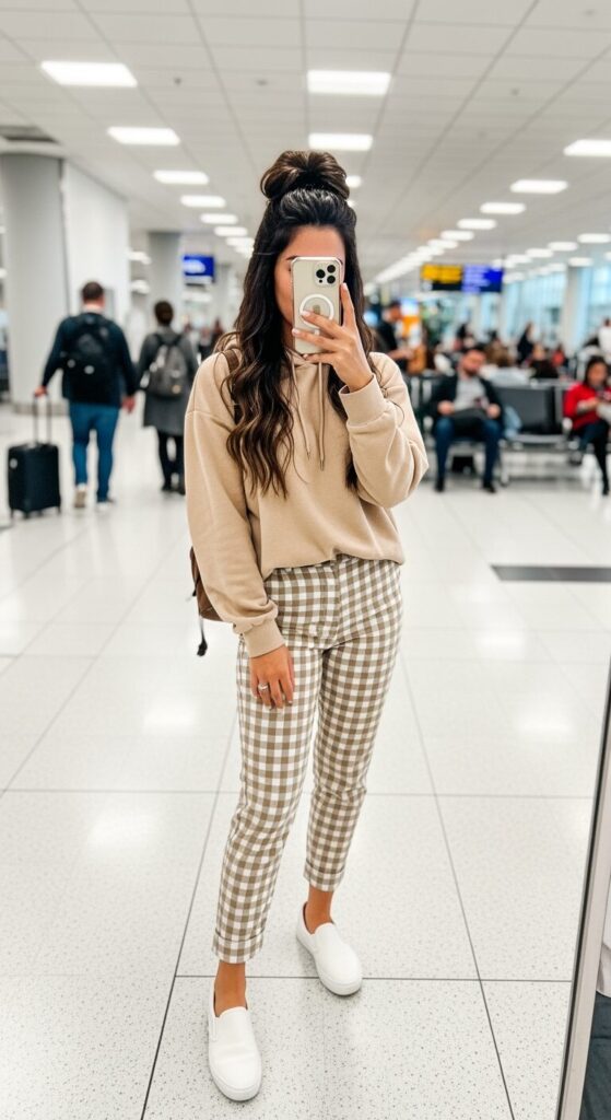 A casual-cute classic. The hoodie is your safe space for cold flights, and plaid pants bring some pattern into play. This is the outfit for people who want to keep it lowkey while still looking thoughtful.