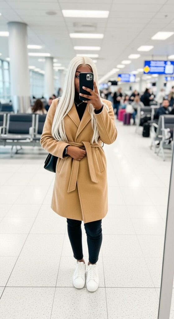 Great for fall or breezy airports. The belted coat makes you feel instantly polished, and skinny jeans keep the look balanced. Throw it over a tee or a thin sweater and it transitions beautifully from airport to street.
