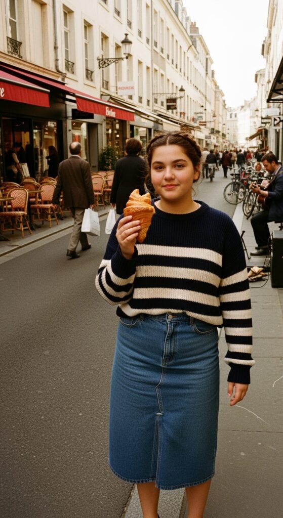 An oversized striped sweater just gives that instant “I’m effortlessly stylish” vibe. And pairing it with a denim midi skirt makes it look more structured and intentional.