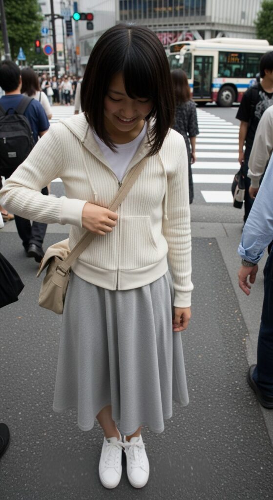 Ribbed Zip-Up Hoodie with a Midi Skirt and Sneakers