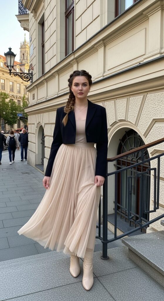 Classic Black Cropped Blazer + Tulle Beige Maxi Skirt + Boots