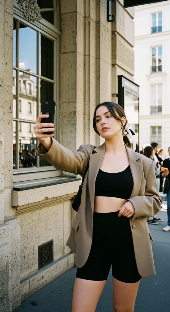 You take biker shorts and a sports bra and then you throw on a blazer and suddenly the whole outfit feels intentional.