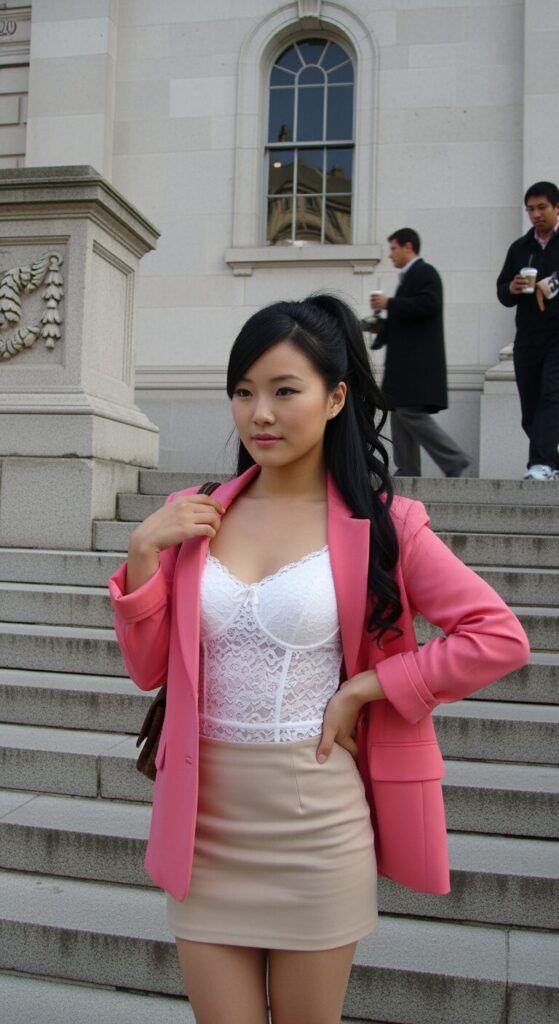 A white lace bodysuit feels so delicate, a beige mini skirt keeps the look clean, and the pink blazer makes everything feel playful and fun.