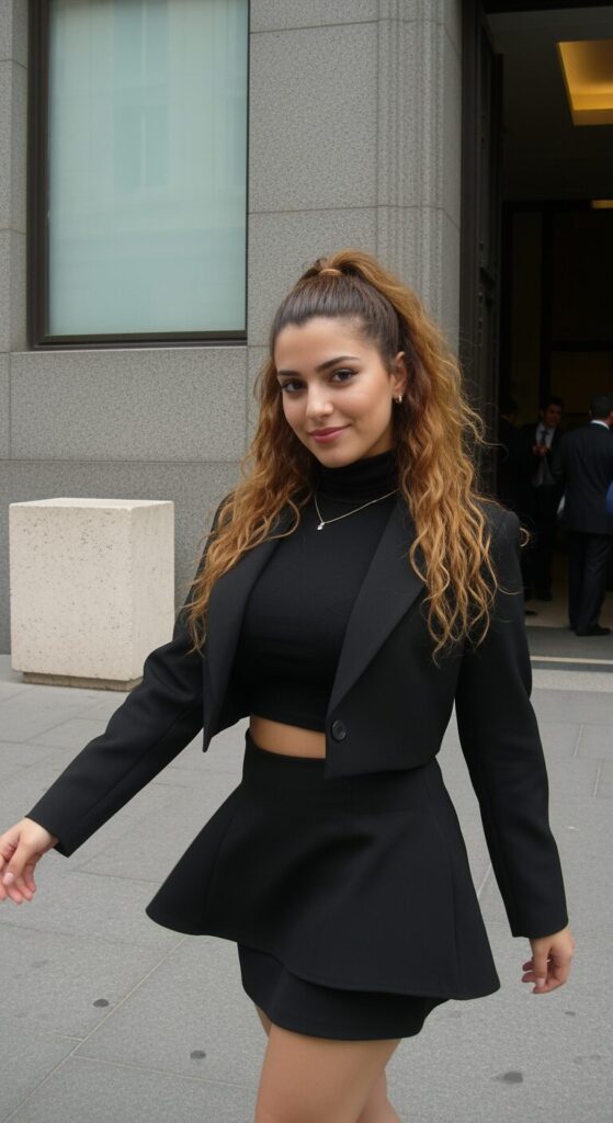 A black turtleneck crop top with a black mini skirt already looks powerful, and layering a black cropped blazer makes it even sharper.