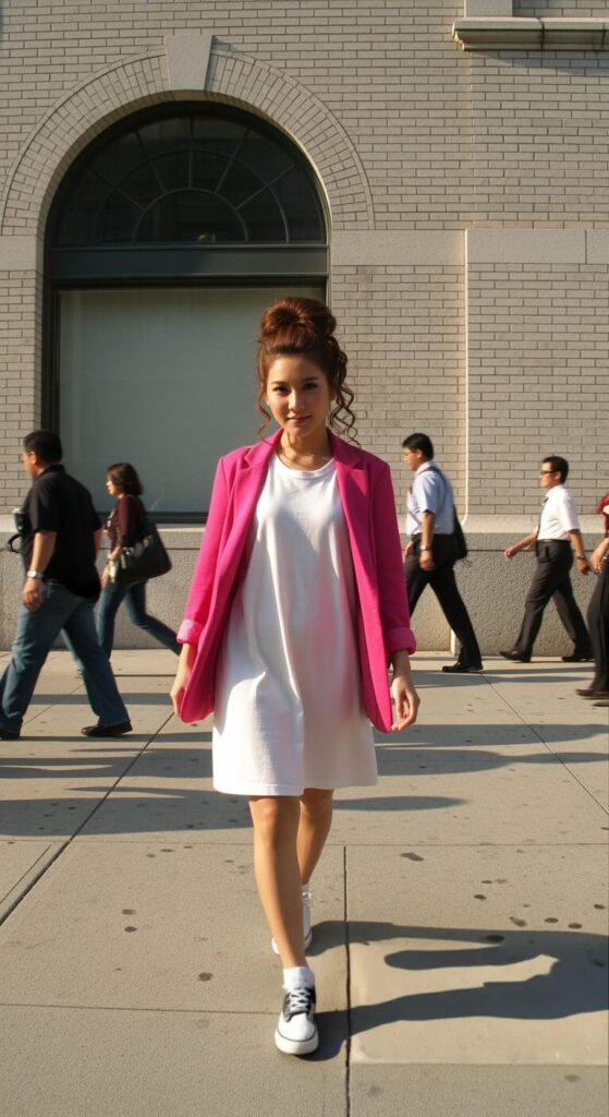 A white oversized t shirt dress is already comfy and flattering, and when I put a pink blazer over it, it suddenly feels styled and intentional.
