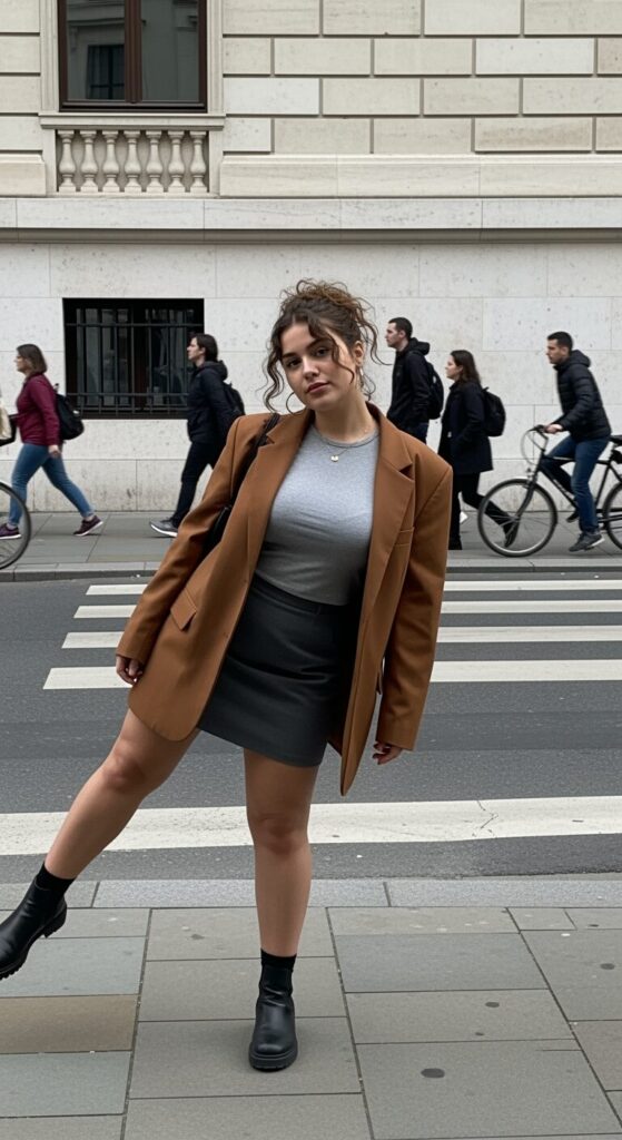 A grey tee with a grey mini skirt just works so effortlessly, and when I add a brown blazer, everything feels softer, cleaner, and way more put together.