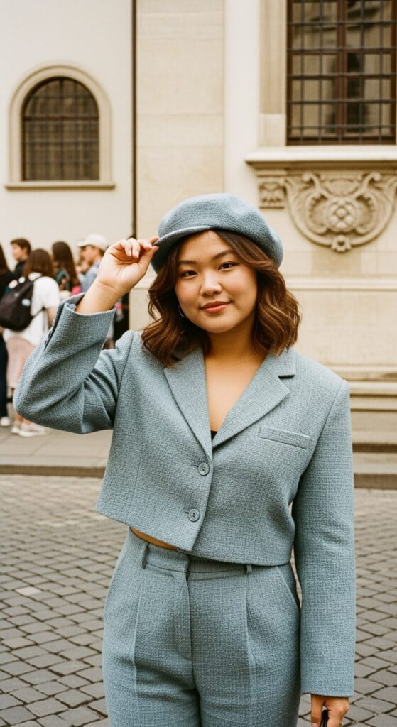A cropped blue tweed blazer with matching trousers already feels elevated, and once I add a cute little hat, it just becomes a fashion moment.