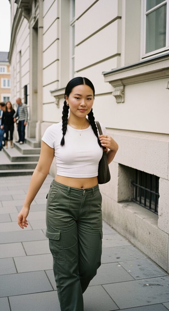 Whenever I don’t know what to wear, I grab a fitted baby tee and cargos. That’s it. The fitted top balances the volume of the pants and suddenly you look styled without trying.