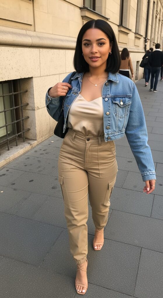 A cropped denim vest instantly adds edge. I love how it highlights the waist while the cargos keep everything grounded.
