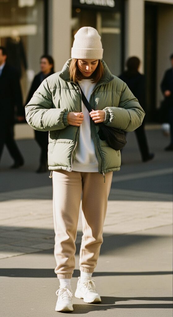 I usually throw it on over comfy joggers for that relaxed, sporty feel that still looks intentional. And of course, I never skip the beanie—it adds that extra bit of warmth and makes the outfit feel casually cool.