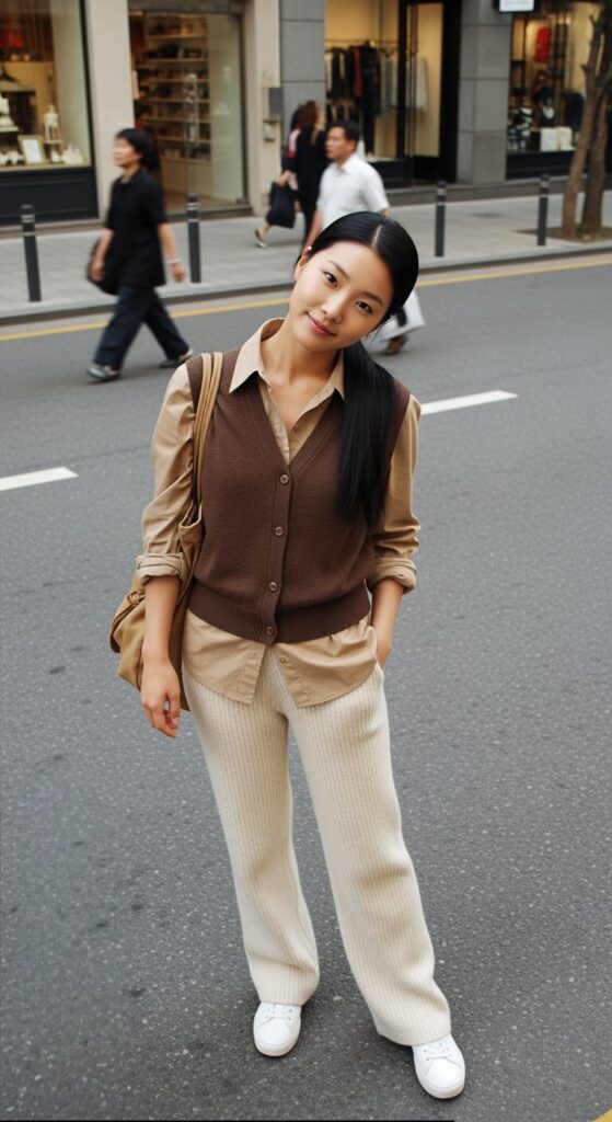 If you love staying warm without feeling like a walking blanket, this outfit hits the sweet spot. A sweater vest keeps your core cozy without the bulk, and when you layer it over a crisp button-up, you instantly look put-together.