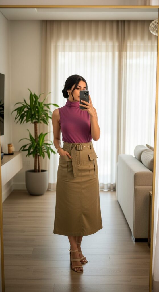 A sleeveless turtleneck feels sleek and polished, while the utility skirt—with its structured pockets or belt—brings just the right amount of edge.