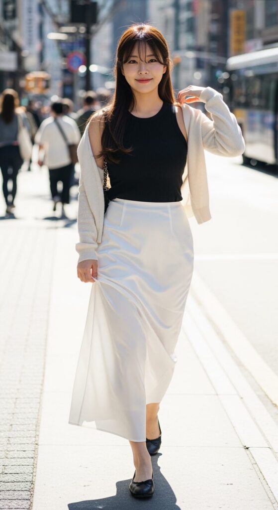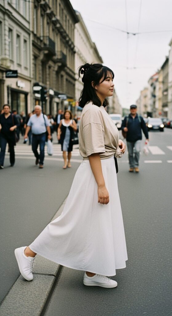 When I choose my shoes, I always think about comfort, style, and how much movement the skirt allows. You’ll notice that even small changes in footwear completely shift the vibe of your white skirt outfit.