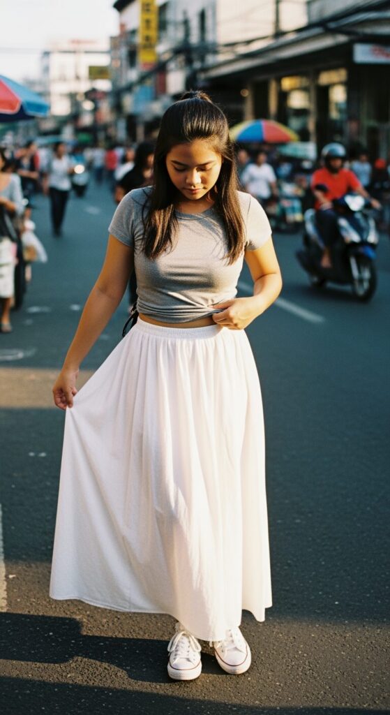 One of my favorite combos is a white long skirt with a simple tee. It’s casual, easy, and effortlessly chic.