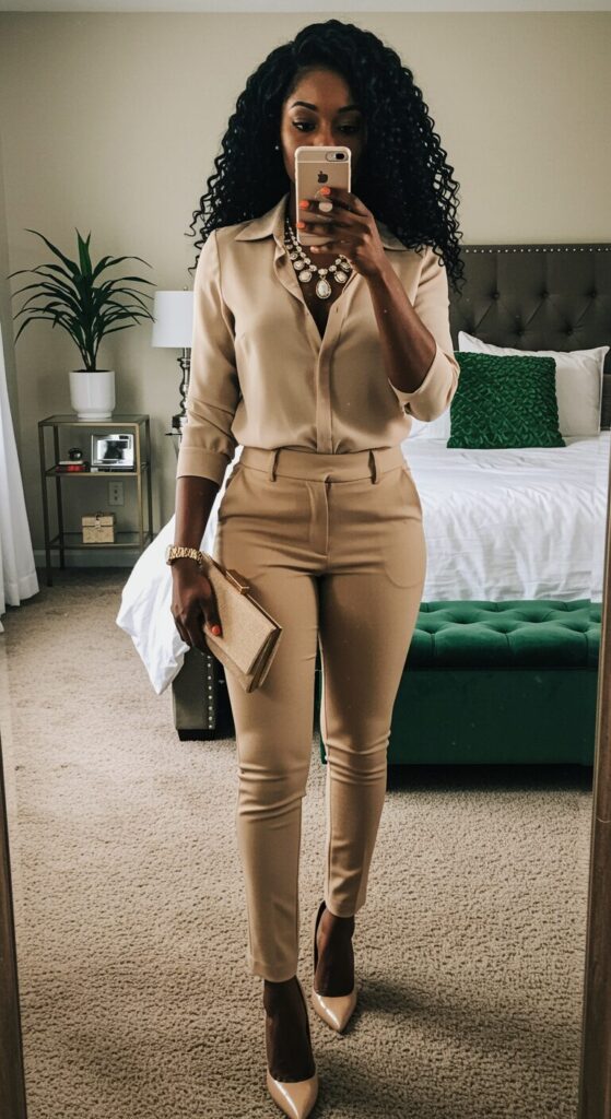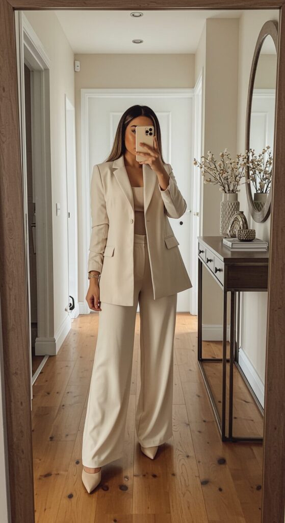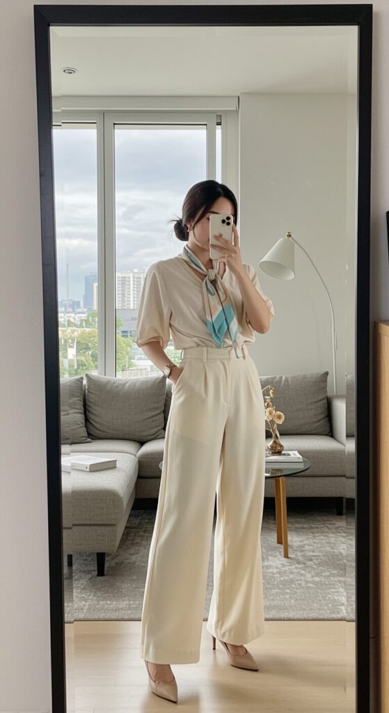 Pairing it with wide-leg trousers creates a balanced silhouette that is both modern and flattering. Nude or pastel heels finish it beautifully.