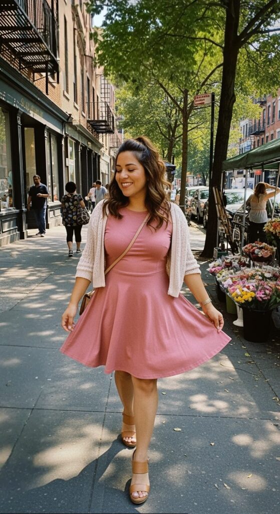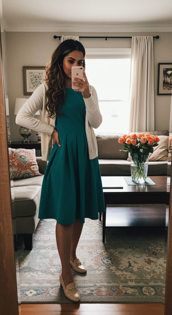 I love pairing a skater dress with a cardigan and low heels because it’s practical but cute.