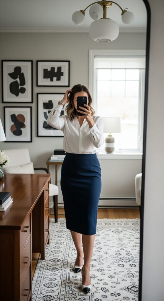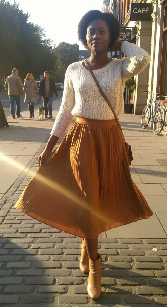 I love pairing a soft midi skirt with a tucked-in sweater, especially in neutral tones. Ankle boots complete the look perfectly.