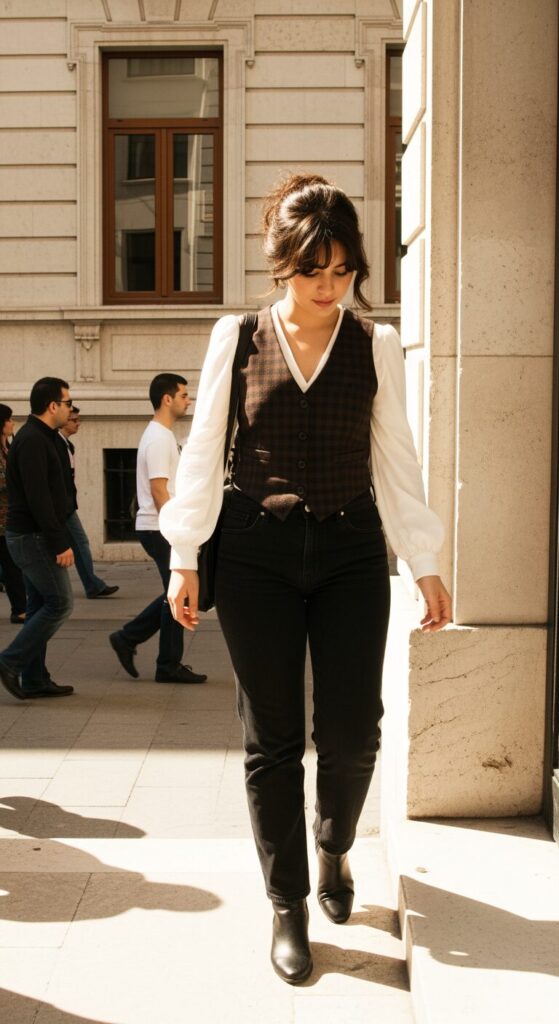 If you love mixing comfy with classy, this one is for you. A checked vest instantly feels smart, and when you layer it over a poet sleeve blouse, the whole outfit becomes so pretty.
