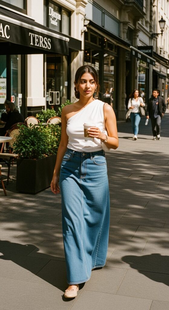 A one-shoulder top with a long denim skirt is such a dreamy combination.