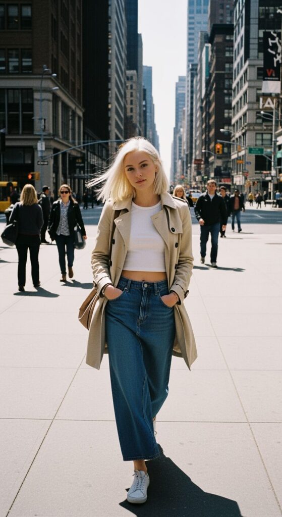 I love how the crop tee keeps the look youthful, while the trench adds sophistication.