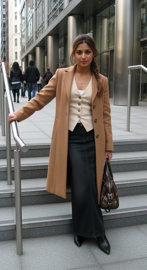 Long Coat + Vest Top + Long Denim Skirt