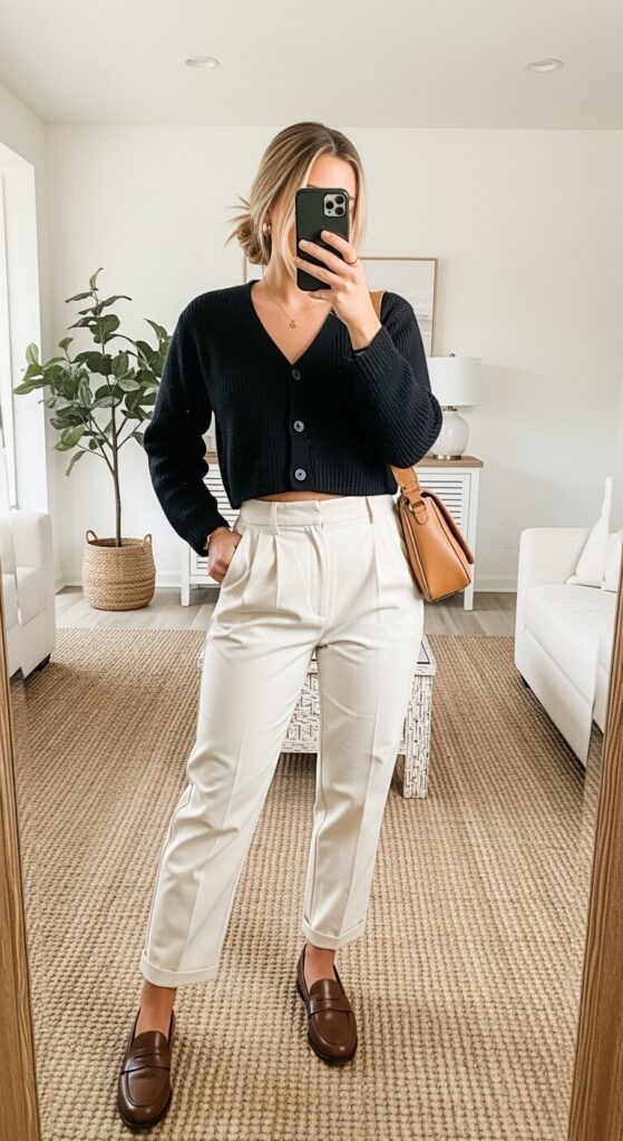 Cropped Black Cardigan + Cream Trousers + Loafers