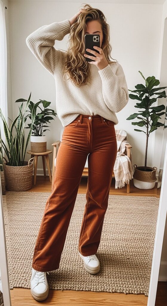 Wide-Leg Corduroy Pants + Wool Sweater + Platform Sneakers