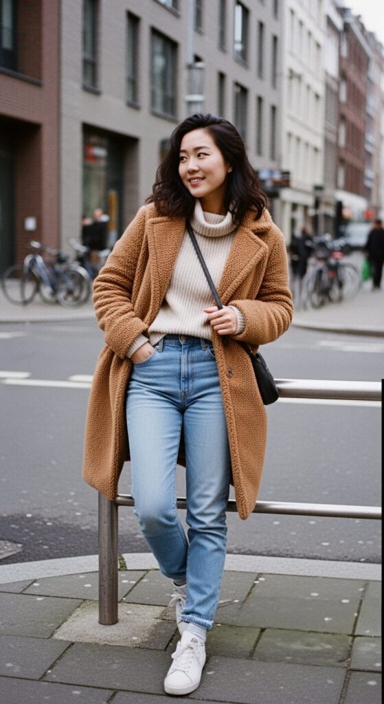 Teddy Coat + Turtleneck Sweater + High-Waisted Jeans + Sneakers