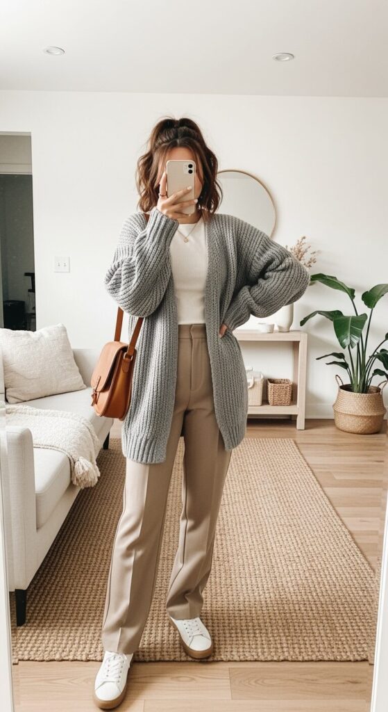 Chunky Knit Cardigan + High-Waisted Trousers + Sneakers