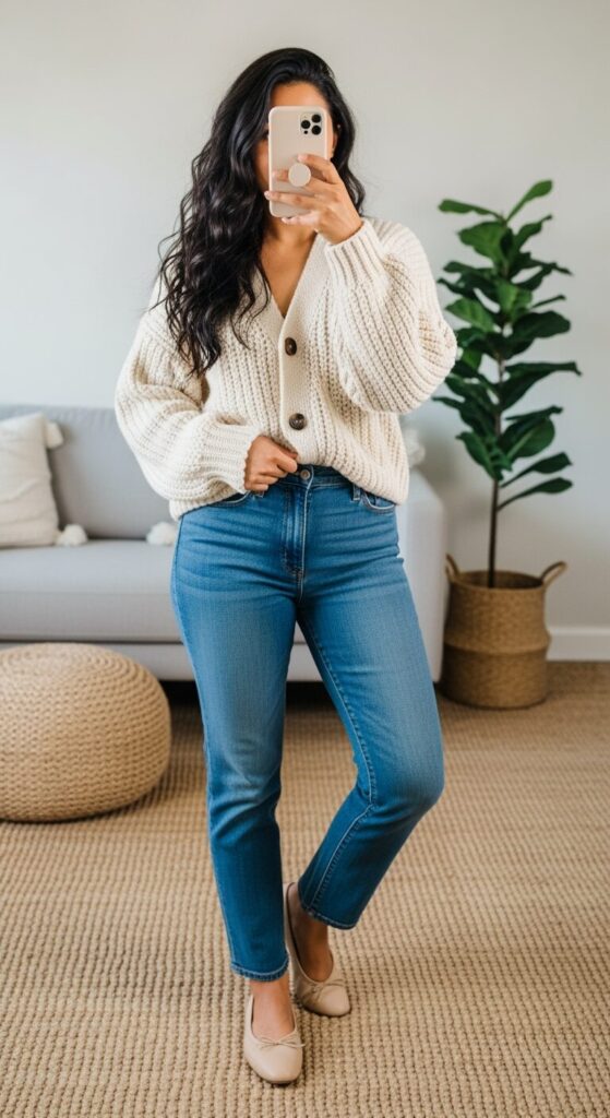 If you’re in your “cozy yet polished” era, this look is for you. Chunky knit cardigans feel like wearing a hug, and they’re so easy to toss over anything.