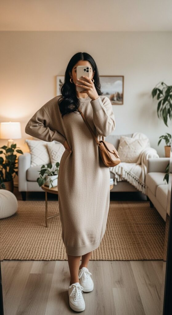 Coffee Tones Sweater Dress + Sneakers + Gold Hoops