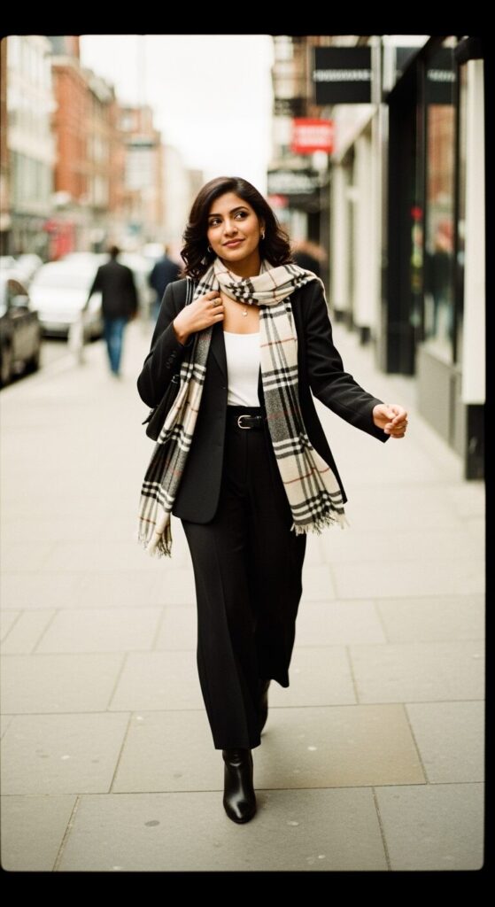 Plaid Scarf + Black Blazer + Wide-Leg Trousers + Heeled Booties