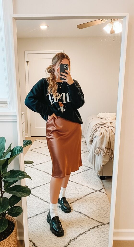 Boxy Graphic Sweater + Satin Slip Skirt + Chunky Loafers