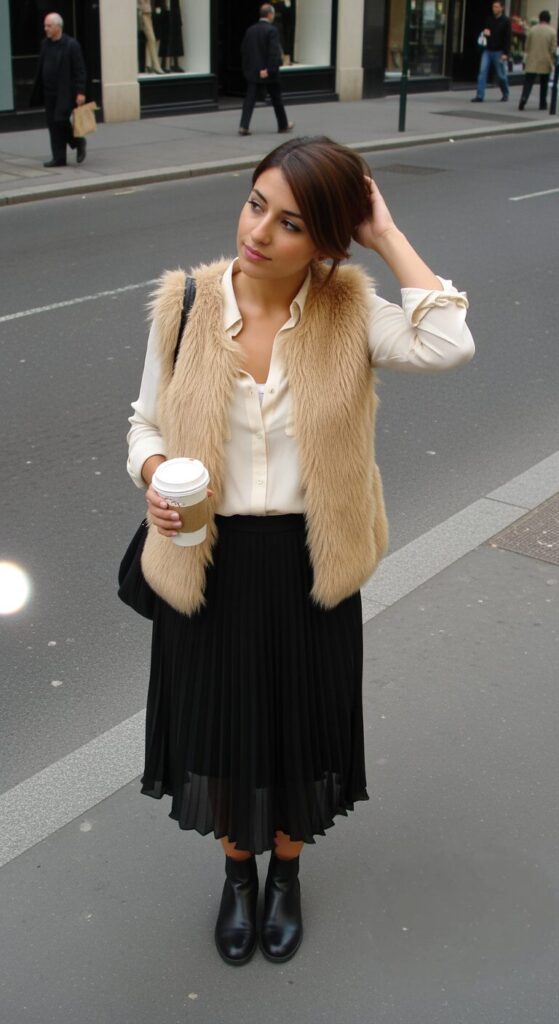 Faux Fur Vest + Button-Down Shirt + Pleated Skirt + Chelsea Boots