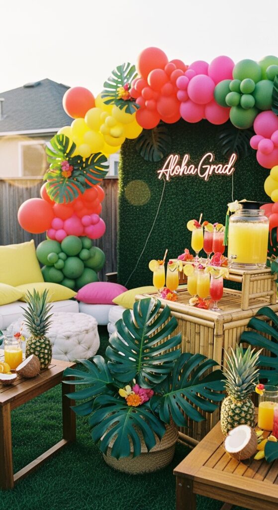 Set up a tropical drink station with names like “Grad Glow” or “Diploma Punch.” Add a grass-style backdrop with a neon sign that says “Aloha Grad”.