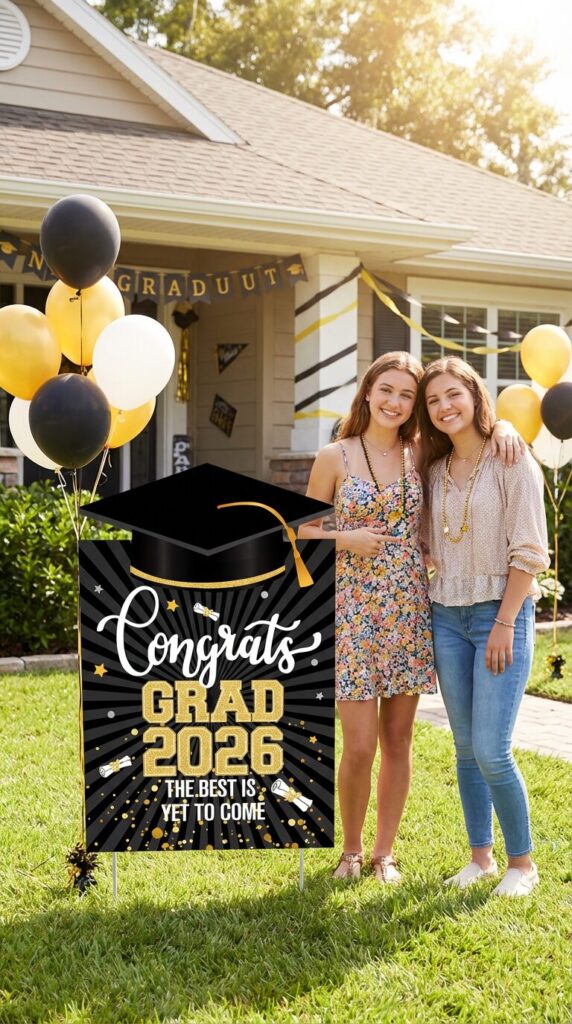 Place the sign in your front yard, near the driveway, or right by the entrance so it is clearly visible. You can pair it with balloons, small banners, or pathway decorations to make the entrance look even more exciting.