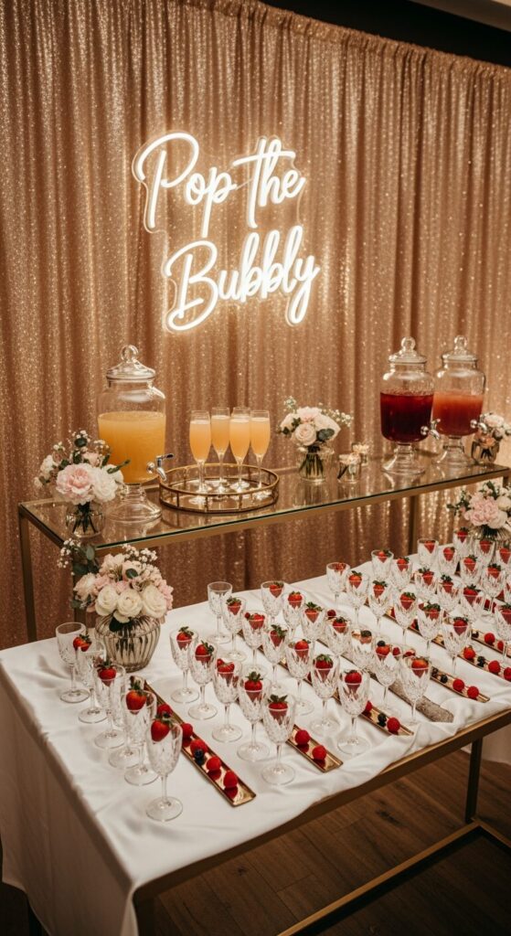 You can include different juices so guests can mix their own sparkling drinks. Add gold trays, glass dispensers, and a statement backdrop behind the bar.