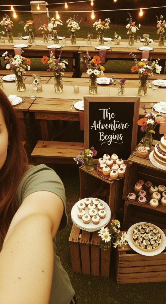 Think wooden tables, mason jars, fairy lights, burlap runners, and wildflowers. Use warm tones like beige, brown, dusty rose, and sage green.