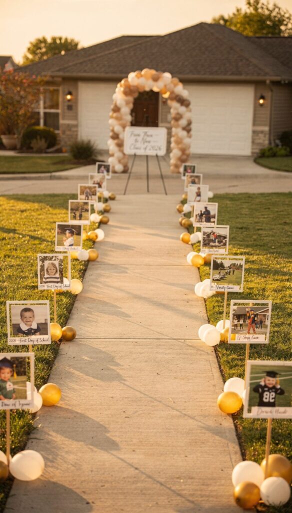 Start by lining your driveway or walkway with printed photos from different stages of life.
