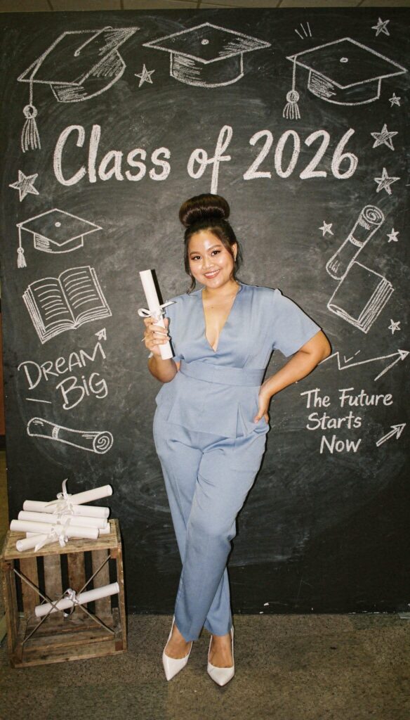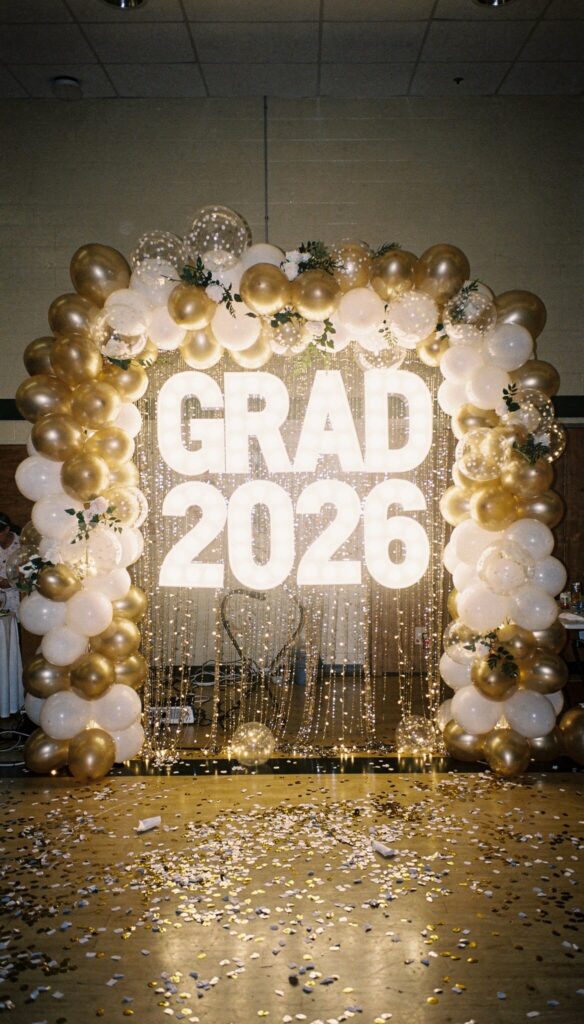 Go big with balloon arches in your favorite colors. You can mix matte, metallic, and transparent balloons for texture. Place giant LED letters spelling out “GRAD” or your graduation year in front.